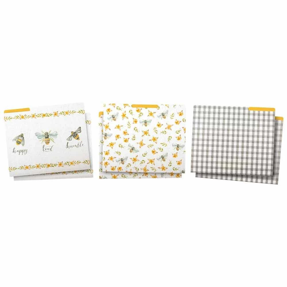 A set of six double-sided, tabbed, letter size file folders from Primitives by Kathy featuring floral bee and plaid designs and "Happy Kind Humble" sentiment.