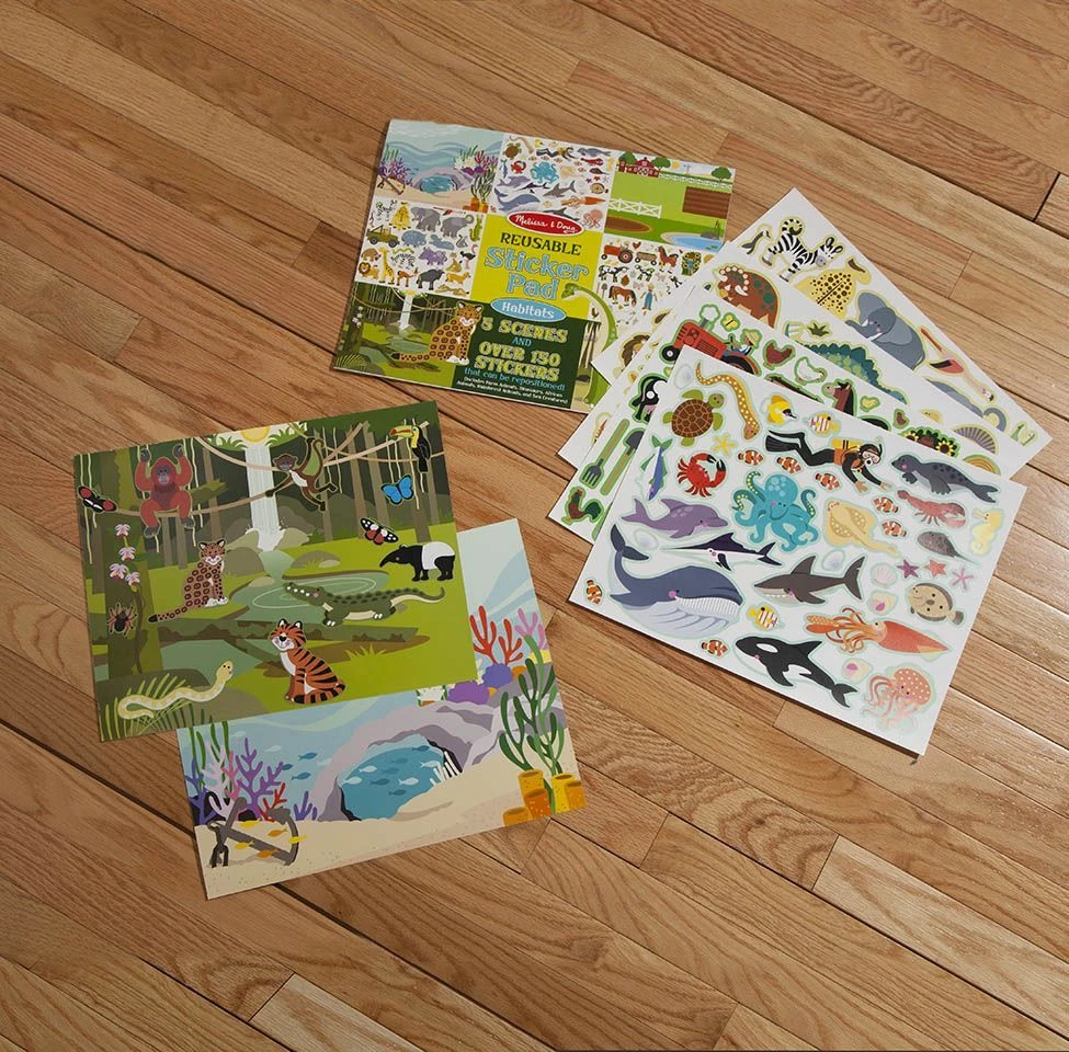 Melissa & Doug Reusable Sticker Pad – Habitats lets your little one visit a farm, a prehistoric landscape, a desert oasis, a jungle, or the deep blue sea, all in this interactive sticker book! The glossy, full-color backgrounds are ready to be filled with more than 150 stickers: Stick a dinosaur by the prehistoric pond and a shark in the ocean — or mix them up and make silly scenes! The easy-to-peel vinyl stickers can be lifted off and repositioned again and again, so kids can follow their imaginations fearlessly.