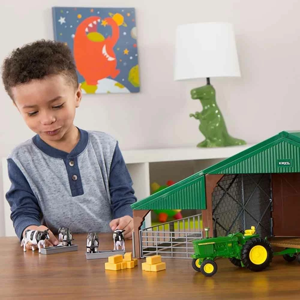 This set features a shed, 1:32 scale John Deere 4020 tractor, hay wagon and hay bales, accessories, animals and (4 cows, 1 dog, 4 chickens.)
