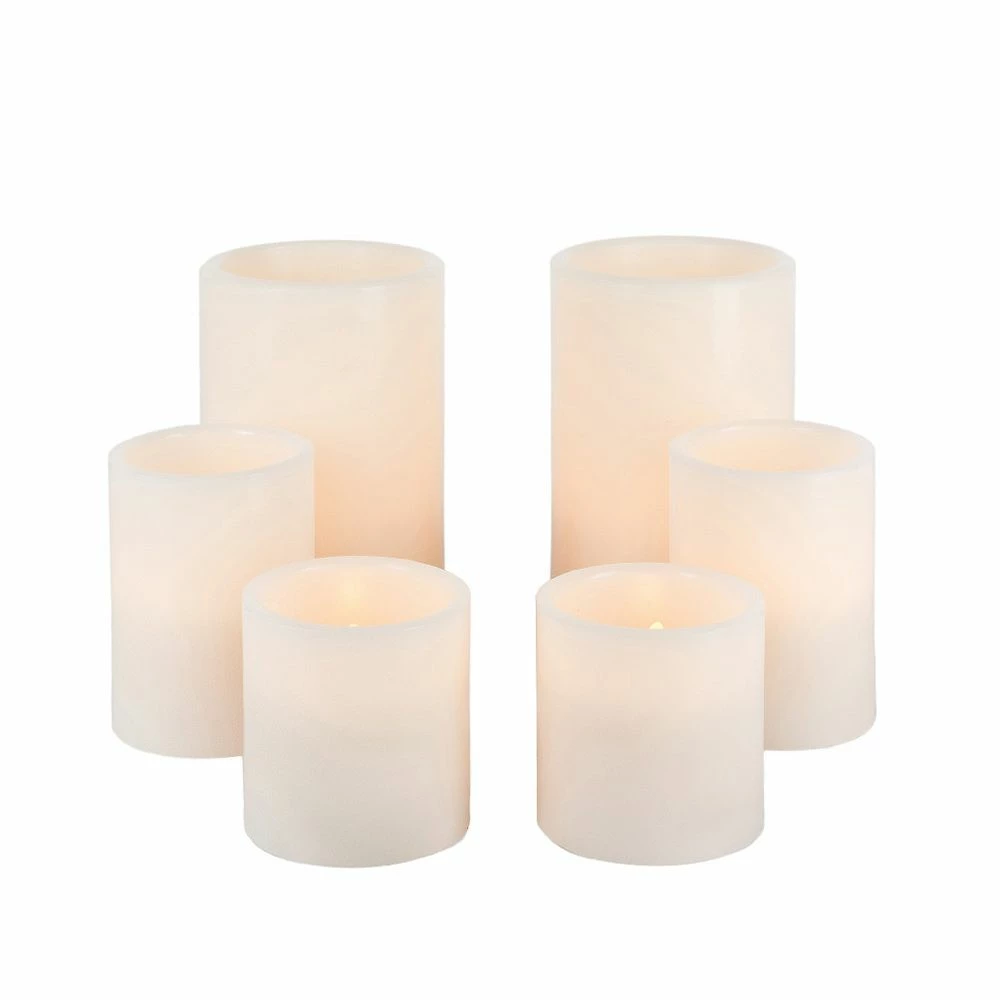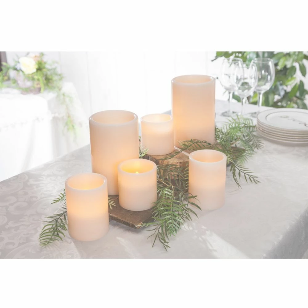 Dispel the darkness and usher in the light with this practical and attractive set of 6, Everlasting Glow 1000 Hour Wax LED Straight Edge Candles. Perfect for a romantic setting or to accentuate your own personal decorating style on the holidays, special occasions or year-round, each candle is artfully crafted in smooth, bisque-colored wax and includes a warm white, energy efficient LED light with our Soft Glow Flicker and Fully Body Glow effects. Intended for indoor use only, each candle is paired in assorted sizes of 3-inches in diameter and 3-inches in height, 3-inches in diameter and 4-inches in height, and 4-inches in diameter and 6-inches in height. Each of these lovely candles has a convenient 5-hour timer feature to conserve energy and each requires 2 AA batteries to operate (not included).