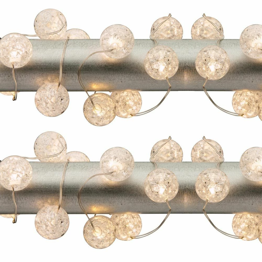 Everlasting Glow Crackled Bead Light String provides endless possibilities for expressing your own unique decorative style. Each of these two enchanting silver strings carries 30 warm white, energy efficient, micro LED lights spaced 4-inches apart and encased in charming crackle bead bulb covers that will light up your home, porch, patio or anywhere else you need to cast that certain glow. Ideal for parties, holidays or year-round use, each string has an 11.8-inch lead cord connected to a durable battery box that holds 3 AA batteries (not included) for controlling the convenient 6-hour time feature. Perfect for indoor or outdoor use, your own decorative flair will shine with these delightful light strings.