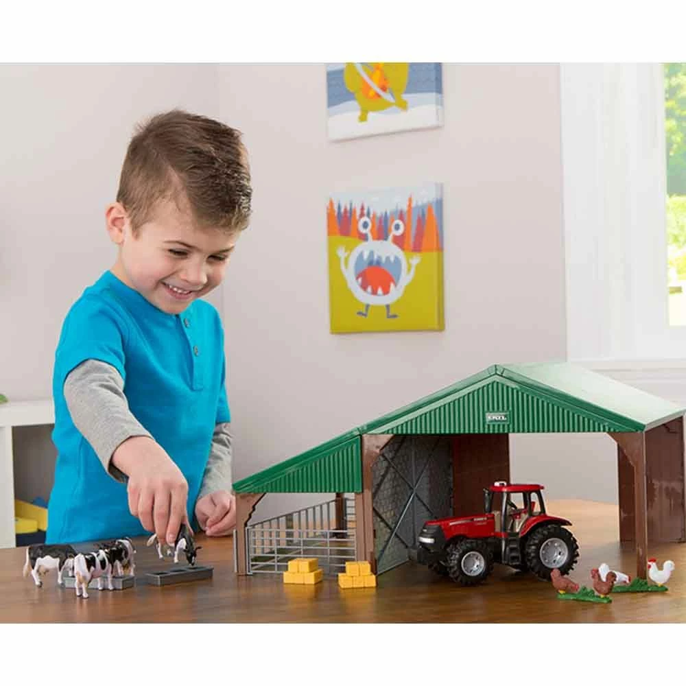This 1:32 Farm Country set features a dual purpose building with room for animals and vehicles, a Case MX305 tractor as well as animals (cows and chickens,) bales and feed bunks. A great addition to anyone's toy box or farm collection.