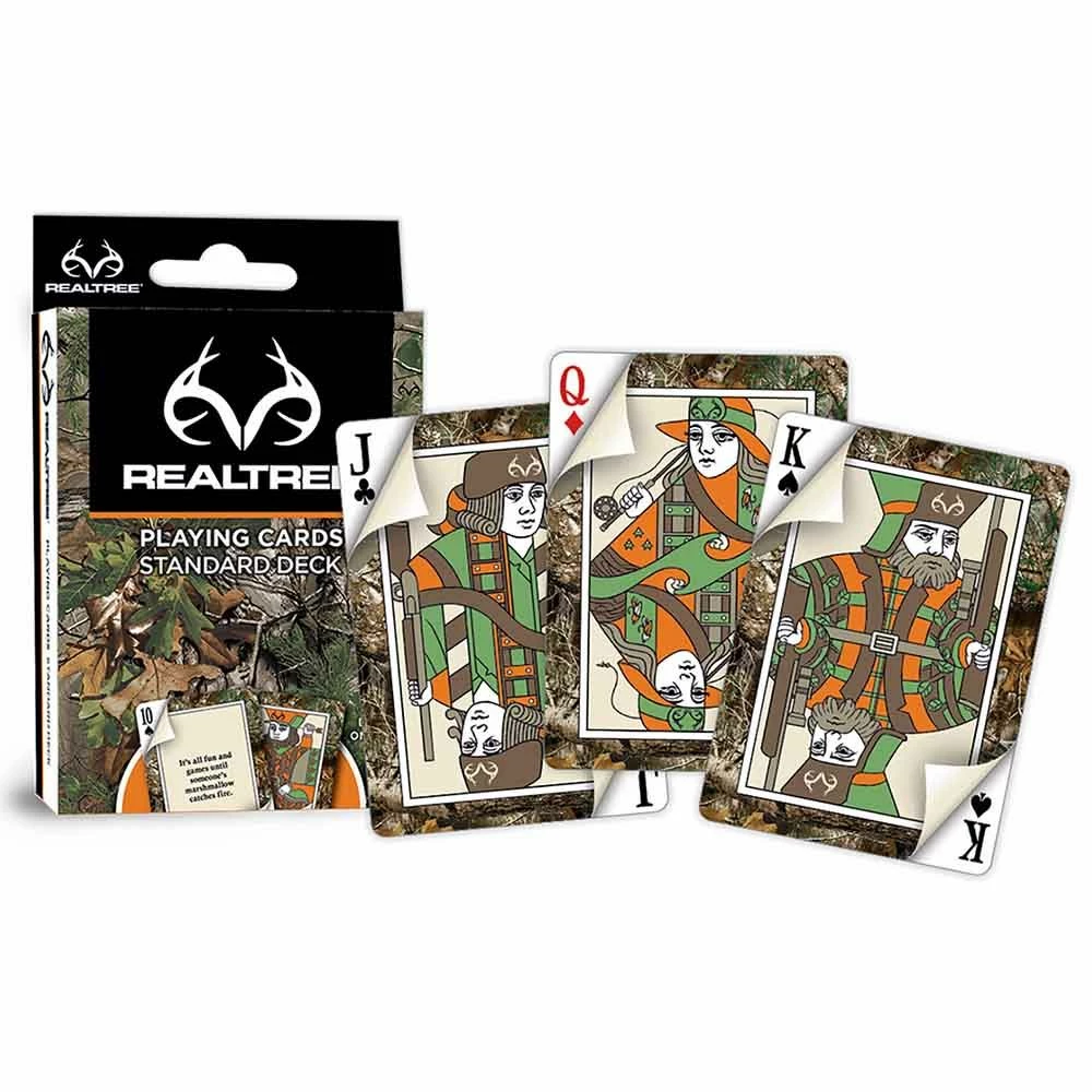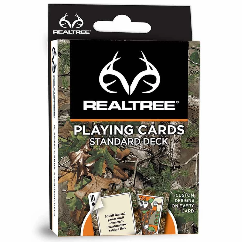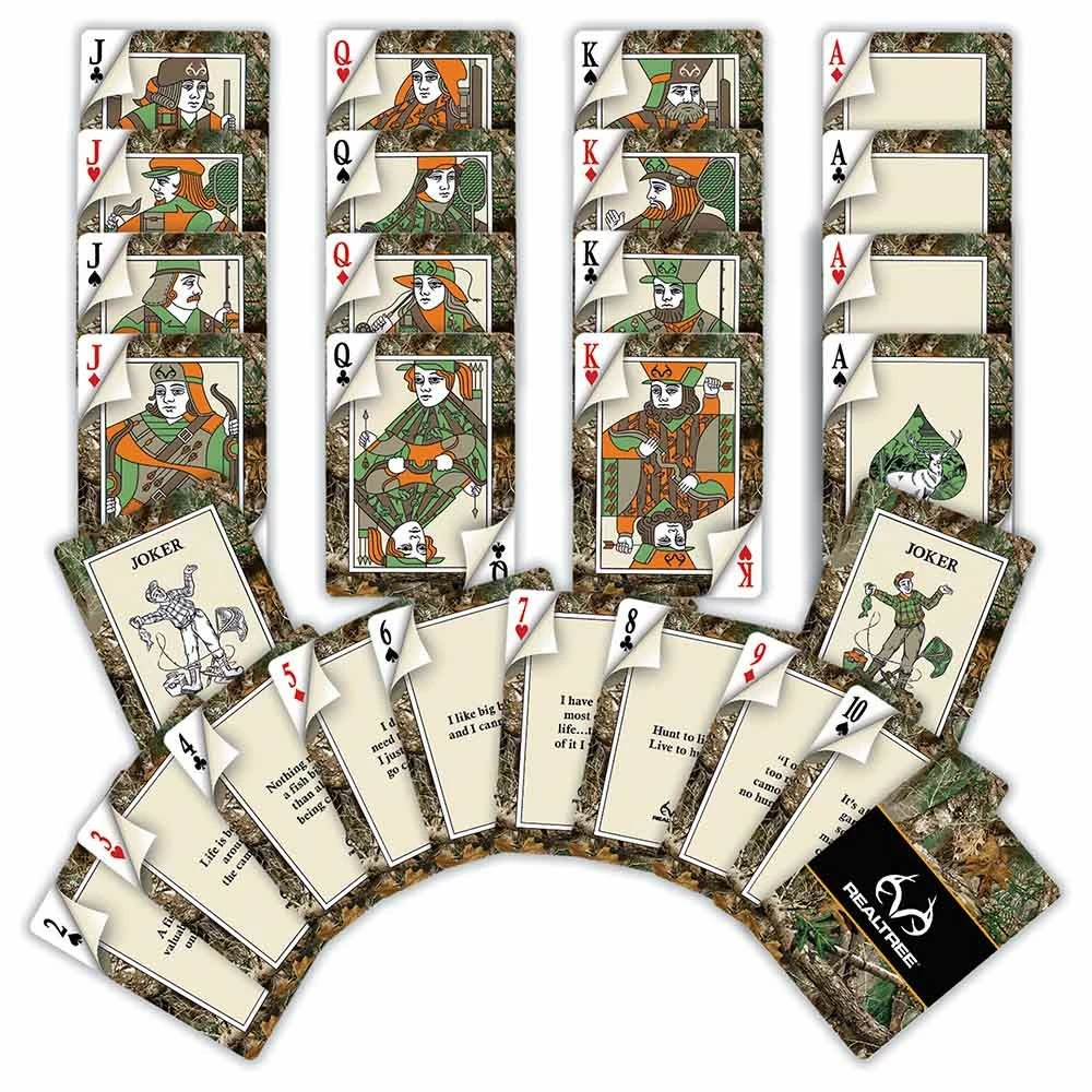 These Realtree playing cards are the perfect deck for any camo fan! Each standard deck contains 52 cards and 2 jokers. Card-back designs feature the Realtree logo. All face cards and jokers have detailed, custom hunter and fisherman designs. Officially licensed and approved Realtree playing cards.